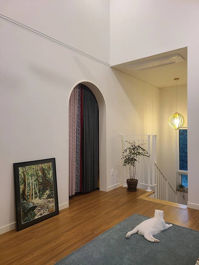 아치형 문은 안방과 2층 욕실, 드레스룸으로 통하는 입구입니다~ 커튼을 내려두어 사적 공간은 가려주면서, 2층 거실 벽에 포인트를 만들었습니다~^^