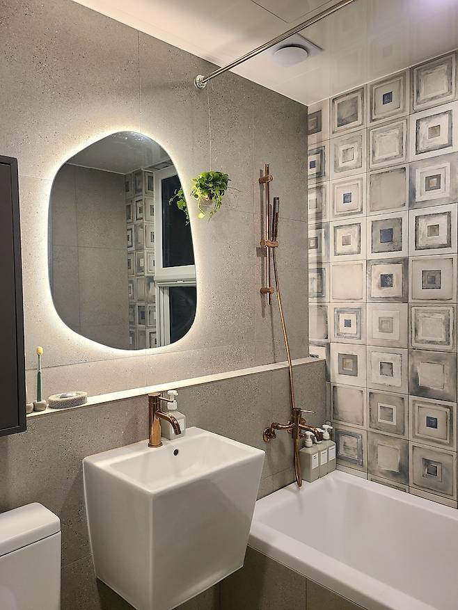 그레이 톤의 2층 욕실이에요. 시멘트 같은 느낌의 타일을 베이스 타일로, 핸드페인팅한 것 같은 타일은 포인트 타일로 골랐구요~ 조약돌 같은 모양의 거울 또한 간접등이 있는 것으로 선택했습니다~^^ 1층의 욕실과는 또 다른 분위기죠~~ㅎㅎ