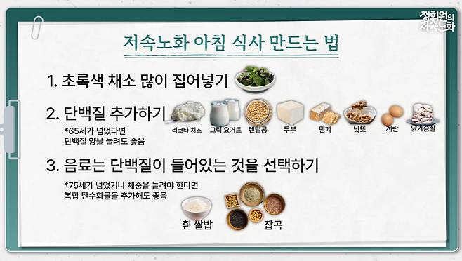 책과 TV 프로그램 출연 등 저속노화식단을 꾸준히 알려온 정희원 서울아산병원 노년내과 교수는 유튜브 채널을 통해 자신의 표준 아침 식사를 공개했다. 정 교수는 '저속노화' 키워드를 유행시킨 장본인이기도 하다. .