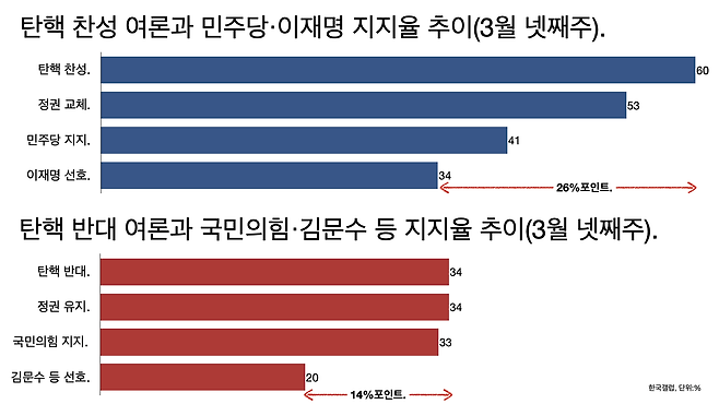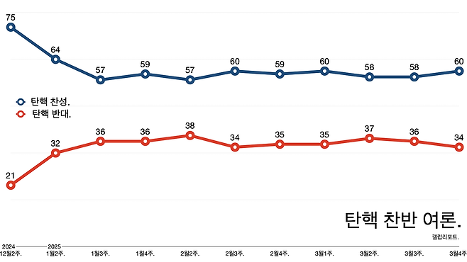 - 탄핵 찬반 여론이 여전히 60%와 36%로 팽팽한 것처럼 보이지만,