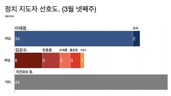 - 여전히 의견 유보 등 지지 후보를 이야기하지 않는 응답자가 44%나 된다.