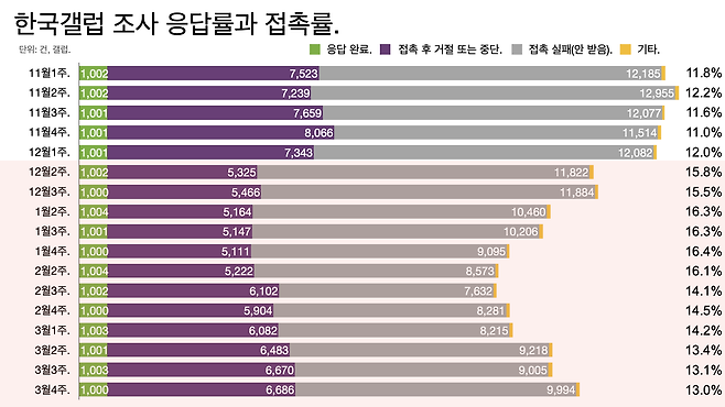 - 비상계엄 이후 ‘접촉 거절’과 ‘접촉 실패’가 크게 줄었지만 3월 들어 다시 늘어나고 있다. 여론조사를 피하는 사람들이 많다는 의미다.