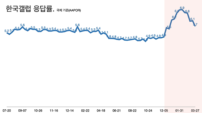 - 치솟았던 응답률도 꺾인 것도 눈길을 끈다. 여론조사에 대한 관심이 식었다는 의미다.