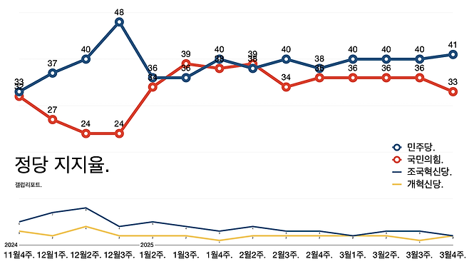 - 정당 지지율이 눈에 띄게 벌어졌다. 민주당과 국민의힘이 각각 41%와 33%, 각각 올해 들어 가장 높은 기록과 가장 낮은 기록이다.
