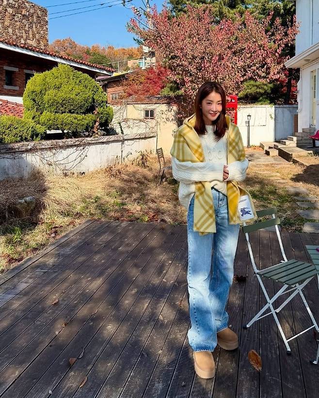 특히 옐로 체크 후드 머플러와 브라운 털부츠를 활용해 고급스럽고 세련된 포인트를 주었습니다.