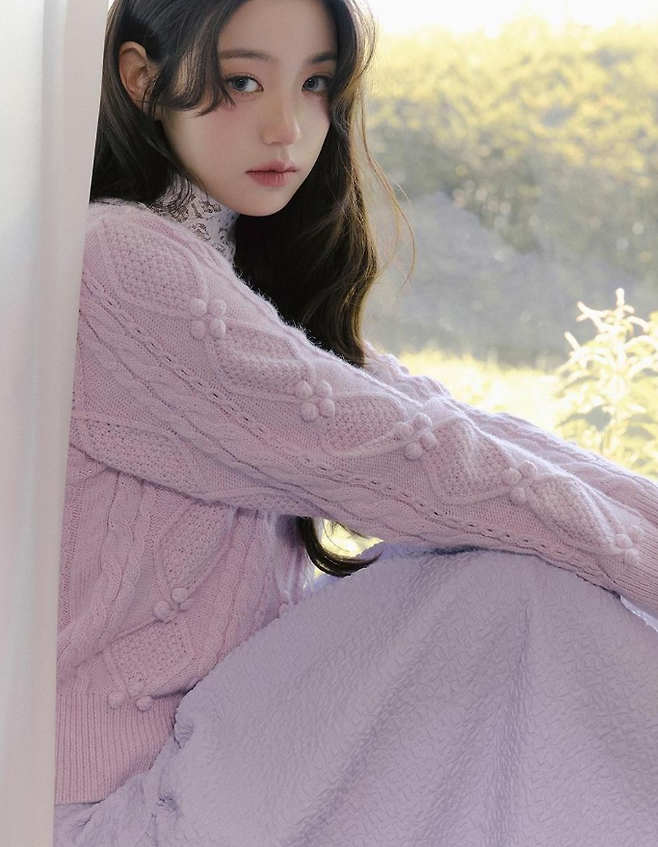 마치 동화 속 주인공처럼 사랑스러움을 한층 더 강조하고 있어요. 니트 특유의 포근한 질감과 폼폼 디테일이 그녀의 밝은 이미지와 완벽하게 어우러져 보는 이들의 시선을 사로잡습니다.