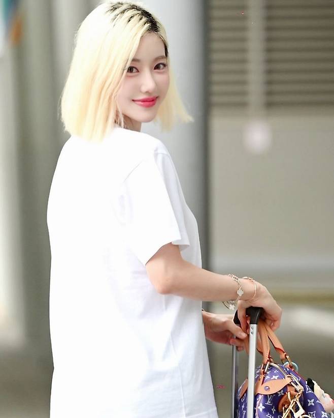 상체에는 화이트 톤의 루즈핏 티셔츠를 착용해 활동성과 캐주얼함을 살렸고, 하의는 타이트한 블랙 핫팬츠로 다리 라인을 강조했다. 전체적으로 상하의의 대비가 명확해 경쾌하면서도 스타일리시한 인상을 남긴다. 여기에 그녀만의 시그니처인 금발 보브컷 헤어와 은은한 핑크 메이크업이 더해져 룩의 통일감을 완성했다.