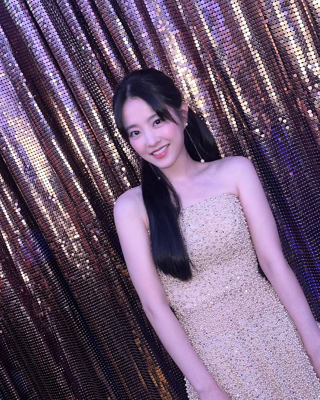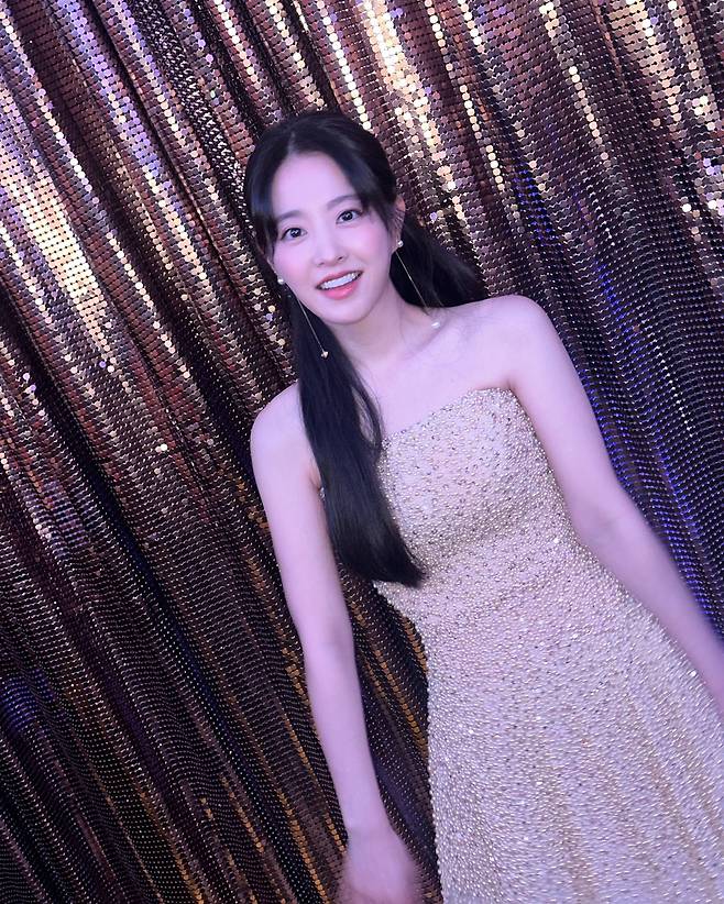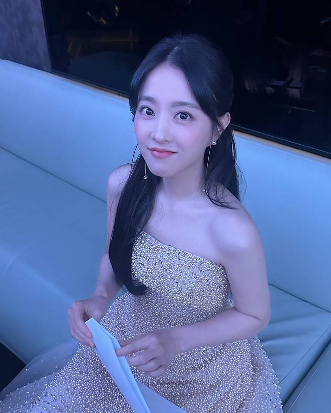 상체부터 스커트 밑단까지 수놓인 비즈 디테일이 조명을 받아 은은하게 반짝였고, 드레스 전체의 곡선이 몸에 딱 붙기보단 자연스럽게 퍼지며 볼륨감을 더했어요.