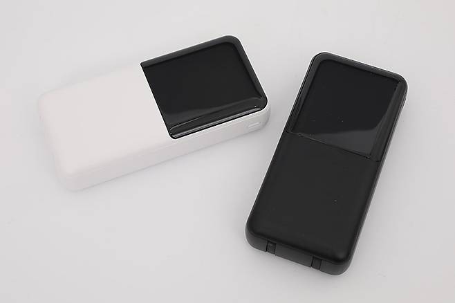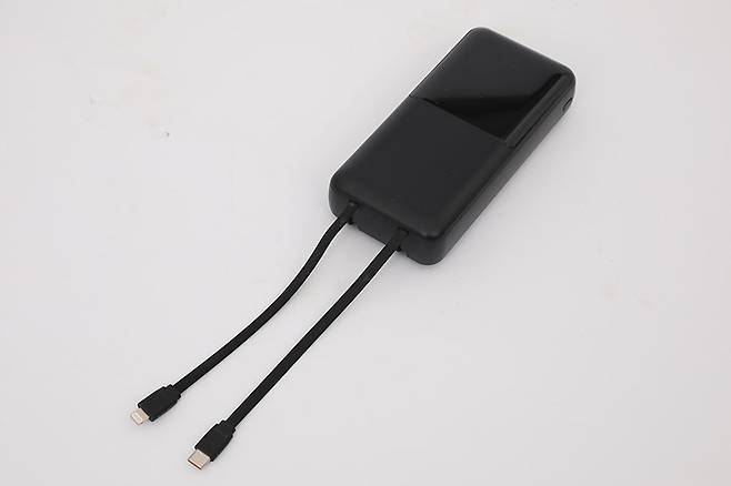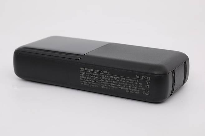 엑스트라 볼트 S21 보조배터리 20,000mAh의 본체 아래쪽 측면을 보면 두 개의 납작한 케이블이 끼워져 있는 것을 확인할 수 있다.