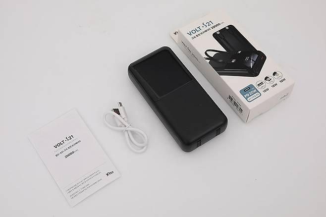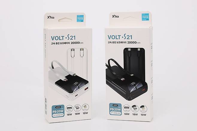 구성품은 엑스트라 볼트 S21 보조배터리 20,000mAh 본체와 충전용 USB 케이블, 그리고 사용 설명서로 이루어져 있다. 색상은 블랙과 화이트 두 가지 중에서 선택할 수 있다.