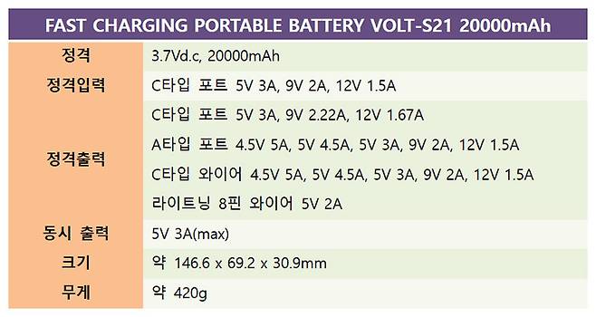엑스트라 볼트 S21 보조배터리 20,000mAh는 20000mAh의 대용량 배터리를 내장해 스마트폰을 여러 번 반복해서 충전할 수 있으며, USB C타입과 라이트닝 케이블이 빌트인 방식으로 내장되어 있어서 별도의 케이블을 준비하지 않아도 스마트 기기를 곧바로 충전할 수 있다. 여기에 두 개의 USB 포트를 갖추고 있어서 케이블만 추가로 준비하면 최대 4대의 스마트 기기를 동시에 충전할 수 있어 가족여행 시에도 편리하다. 또한 10W를 지원하는 라이트닝 케이블을 제외하면 나머지는 18W에서 20W까지 고출력을 지원해 고속 충전을 지원하는 기기는 더욱 빠르게 충전할 수 있으며, 보조배터리 자체 충전도 18W를 지원해 빠르게 충전할 수 있다는 점이 가장 큰 장점이라고 할 수 있다.