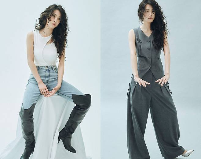사진 속 강지영은 히피펌을 하고 청바지와 부츠, 탱크톱으로 터프한 무드의 의상을 선보이고 있다. 또 다른 사진에서는 바지와 베스트로 구성된 셋업 정장, 셔츠와 재킷 등 다양한 스타일링을 통해 ‘테토녀(터프하고 도회적인 여자)’의 매력을 발산하고 있다.