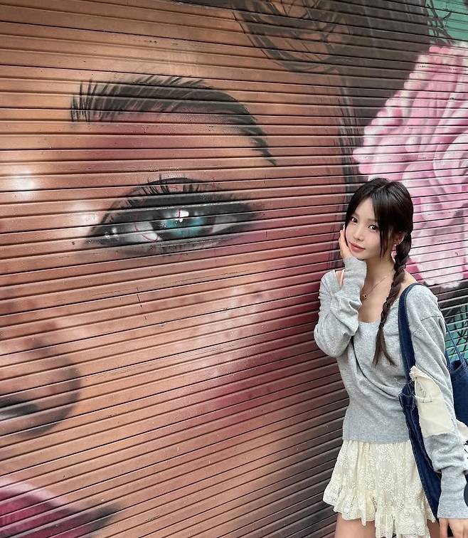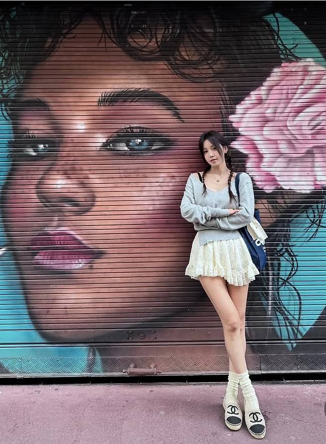 루즈한 그레이 니트와 크림 컬러의 레이스 미니 스커트를 매치해 걸리시하면서도 내추럴한 분위기를 연출했습니다.