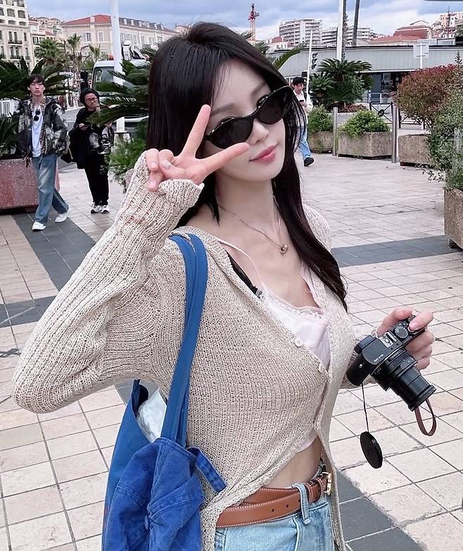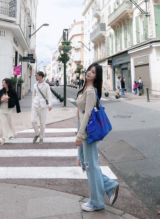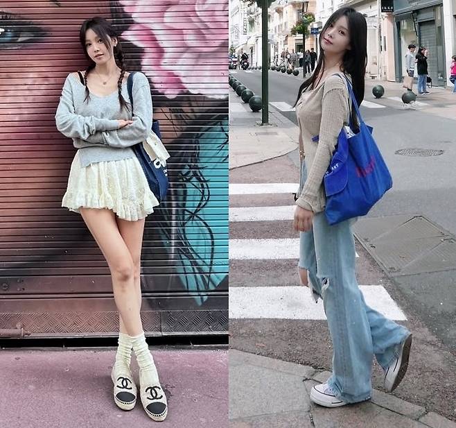 큼직한 코발트블루 컬러의 에코백이 스타일에 포인트를 더하며, 전체적으로 실용적이면서도 감각적인 스타일을 완성했습니다.