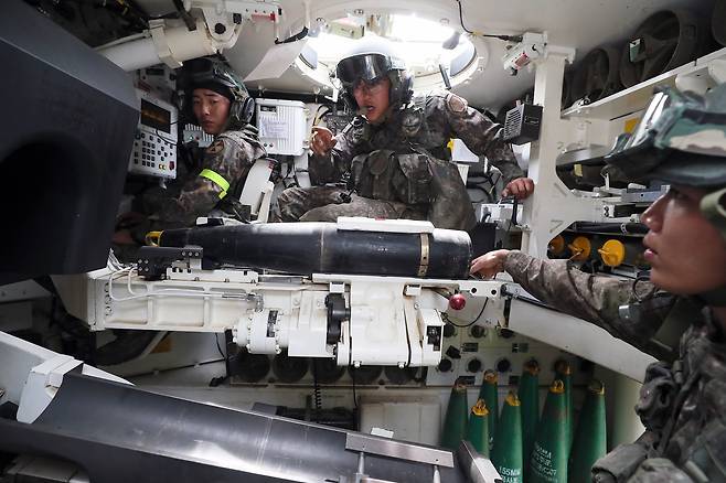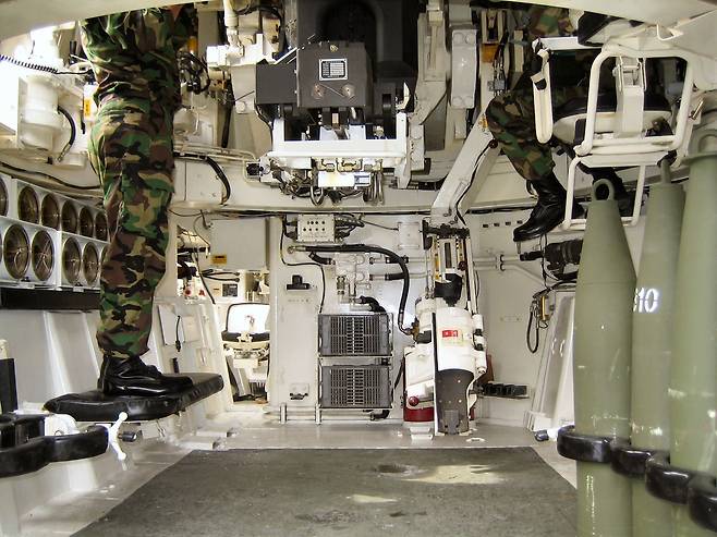 자주포 내부에는 포탄과 뇌관 보관 공간이 체계적으로 정리되어 있으며, 유압 장전장치와 자동 송탄기가 장착돼 있어 인력 부담을 줄인다.