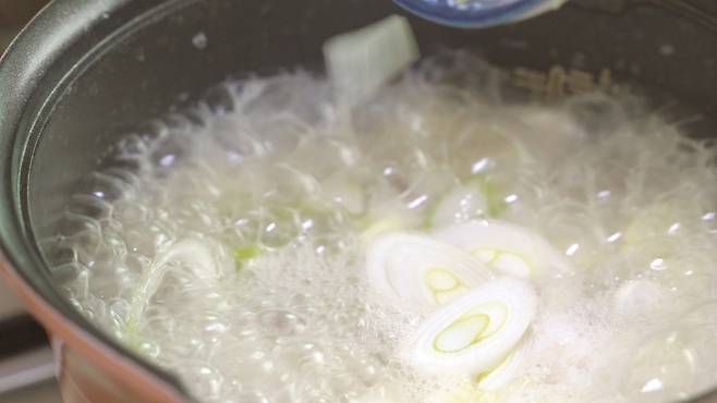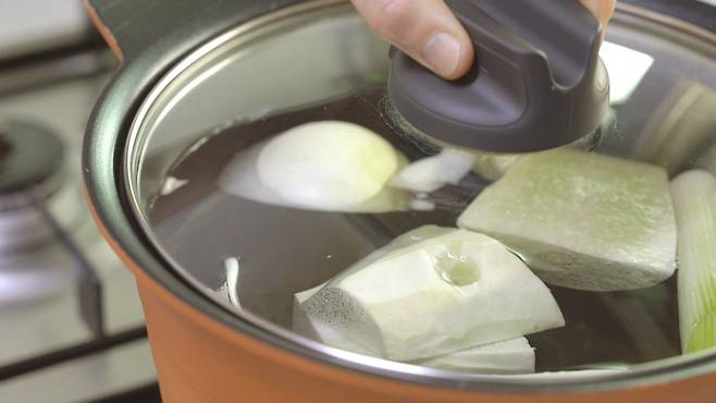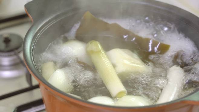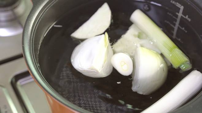 이제 큰 냄비에 무, 양파, 대파, 다시마를 넣으세요. 처음에는 '강불'에서 끓어오르기 전까지 끓이세요.