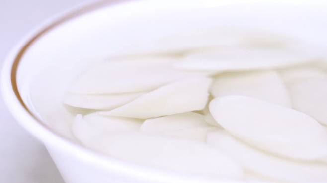 육수가 끓기 시작하는 동안 기타 재료를 준비하세요. 먼저 떡국떡은 미리 물에 넣어 불려 놓아야 더욱 맛있게 요리가 된답니다.
