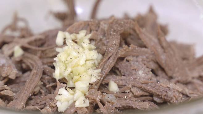 식은 고기를 결 반대로 찢은 후, 소주 1T, 참기름, 소금, 후추, 다진 마늘 반스푼을 넣고 양념을 해 놓으세요.