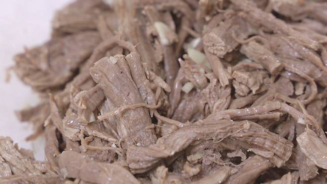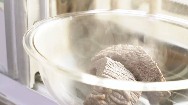 익은 고기는 한 김 식히세요. 바로 고기를 손질하면 너무 뜨거워 손에 화상을 입을 수 있어요. 그래서 주의해야 해요!