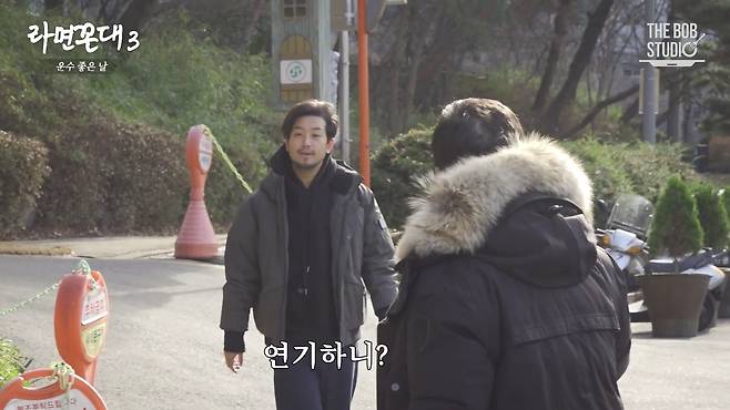 김성철은 올블랙 이너와 팬츠 위로 파란색 패딩을 걸쳐 포인트를 주었고,