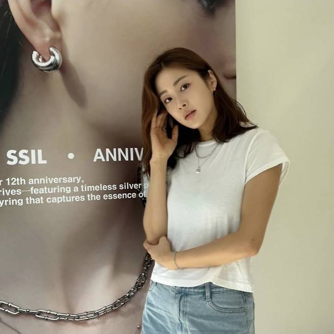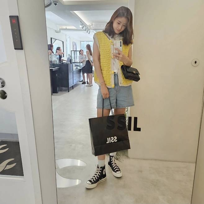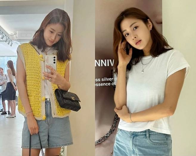 강소라는 깔끔한 화이트 크롭 티셔츠에 연청 데님 반바지를 매치해 상큼한 여름 무드를 완성했습니다.