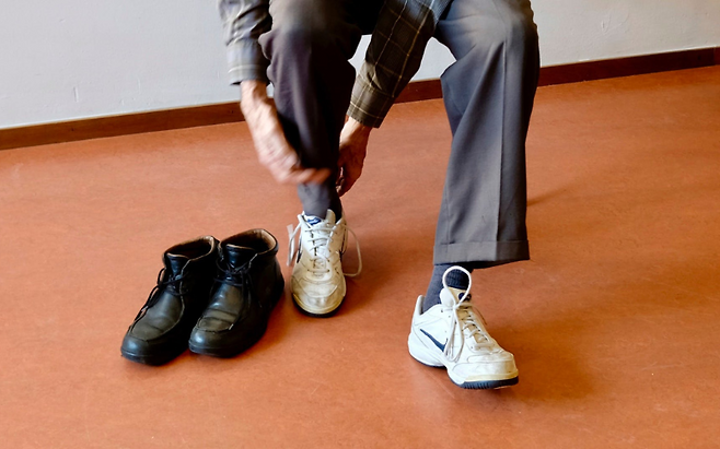 발에 맞는 사이즈로 헐떡이거나 발등을 짓누르지 않게 착용하며, 걸을 때 쿵쿵거리거나 끌어 소음과 방해를 만들지 않는다.