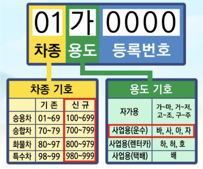 숫자 사이에 끼어있는 한글 문자 하나. 이것은 그 차가 '어떤 목적'으로 사용되는지를 알려줍니다.