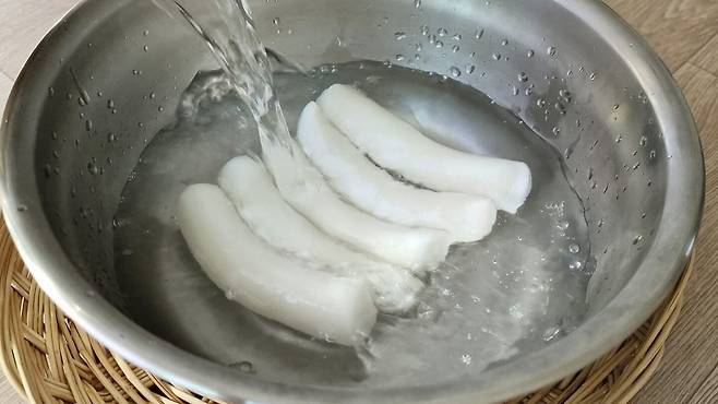 이제 가래떡이 잠길 수 있도록 뜨거운 물을 부어 놓으세요. 20분 정도 기다리기만 하면 끝입니다. 이대로 두면 떡이 서서히 해동되는 것을 볼 수 있어요.