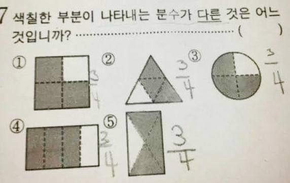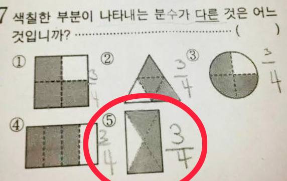 이 문제의 정답 해설을 보면, 분수는 기본적으로 "등분" 즉 같은 크기로 나누는 것을 의미한다고 합니다. 1번부터 4번까지는 같은 모양 크기의 정확한 3/4인데.. 5번도 3/4 처럼 보이는 이유는 4개중에 3개라고 오해해서 그냥 3/4인 것 처럼 보이지만 5번은 같은 크기가 아니라서 3/4이라고 하면 안된다고 합니다. 그래서 정답은 5번입니다.
