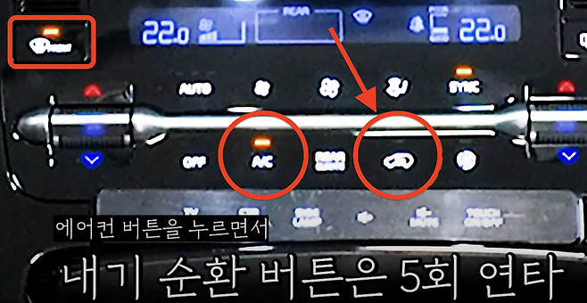 그 상태에서, 'A/C' 버튼을 누른 상태를 유지하면서, 동시에 '내기 순환' 버튼을 빠르게 5번 누릅니다.