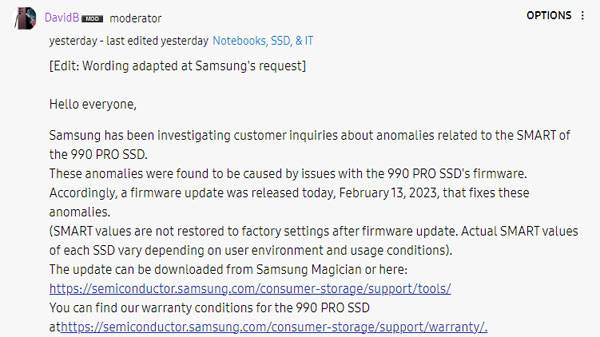 삼성전자 990 Pro 시리즈 SSD는 실제 쓰기 작업 용량과 무관하게, 원인을 알 수 없는 수명 급감 현상이 보고되었는데, 삼성 독일 커뮤니티 관리자가 해당 증상이 수정된 펌웨어 배포가 시작되었음을 알렸다.