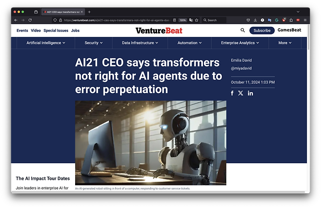 출처: AI21 CEO says transformers not right for AI agents due to error perpetuation | VentureBeat (벤처비트, 10월 11일)