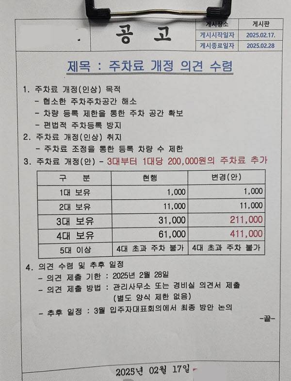 [땅집고] “앞으로 우리 단지는 자동차 2대 이상 보유 가구에 차량 주차비를 부과합니다. 2대 이상은 2만원, 3대 이상은 22만원입니다. 4대 이상은 52만원입니다. 5대는 등록이 불가능합니다.”