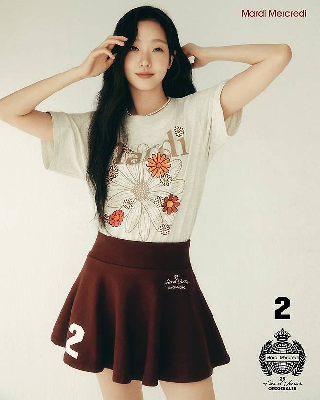 마르디 메르크르디 브랜드의 플로럴 크림 톱과 버건디 스커트로 로맨틱한 룩을 완성하고 있다. 플레어 스커트와 꽃무늬 디테일로 페미닌한 매력을 한껏 드러냈다.