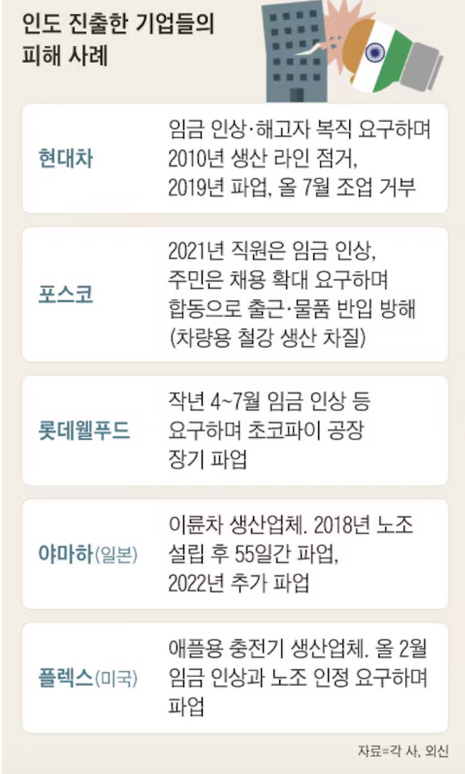 한국은 인도에 대한 누적 투자 순위 13위에 오를 만큼 적극적으로 인도 시장에 진출해왔습니다. 하지만 삼성뿐만 아니라 현대차, 포스코, 롯데 등 수많은 한국 기업들이 정치색이 짙은 강성 노조의 파업으로 몸살을 앓고 있습니다. '저임금'과 '풍부한 노동력'이라는 장점이 '노조 리스크'라는 단점에 가려지고 있는 것입니다.