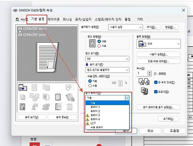 추가로 인쇄 기능 활용방법 한 가지 공유드려 보겠습니다. 회사에서 이면지와 새 용지를 복합적으로 사용 시 매번 트레이에 용지를 넣었다 뺐다 하기 매우 번거롭습니다. 이때, 급지 트레이 기능을 적극 활용하면 좋은데요 하나의 트레이에 이면지, 다른 하나의 트레이에 새 용지를 넣고 급지 트레이 설정 탭에서 출력할 용지를 결정해 주면 됩니다.