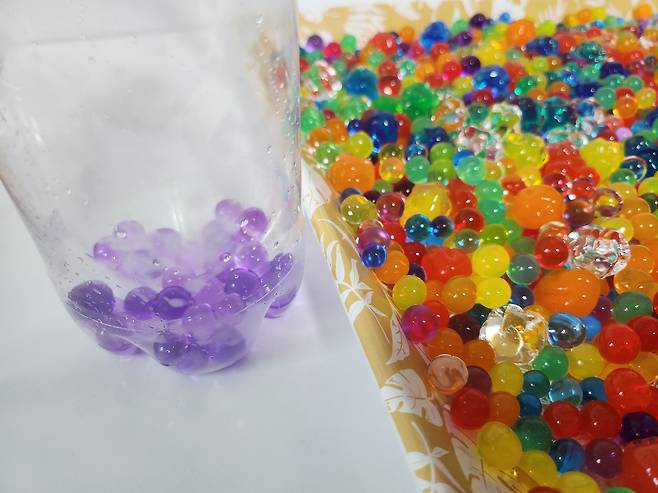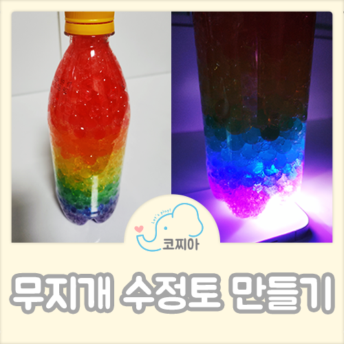 오늘은 아이와 집에서 수정토를 가지고 놀다가 버리기 전에 이걸 어떻게 응용하면 좋을까 생각하다 무지개 수정토 만들기를 해보았어요! 수정토는 처음에 굉장히 작은 알갱이 인데, 물에 불리면 말랑말랑하게 불어나는 촉감놀이가 가능한 재료랍니다. 일명 개구리알이라고도 불려요. 버리실 때는 말리신 후 일반 쓰레기에 버려주시면 된답니다!