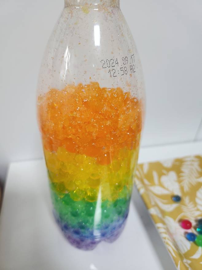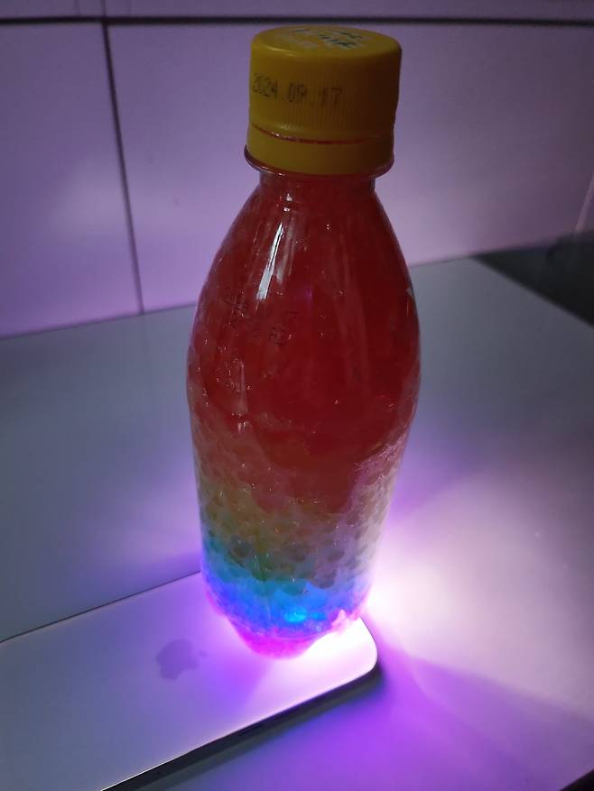 저희는 물을 살짝 넣고 뚜껑을 닫아 완성했어요. 이렇게 그냥 봐도 너무 예쁘지만 밤에는 무지개빛 무드등으로 변신 시킬 수 있답니다.