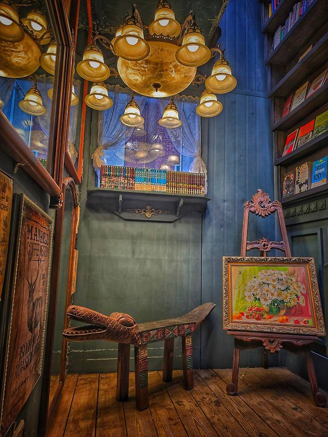 • 벽면을 가득 채운 고서적 책장과 골동품 소품들,클래식 음악과 은은한 조명이 어우러져해리포터의 호그와트 도서관이나 기숙사 라운지 같은 분위기가 물씬!