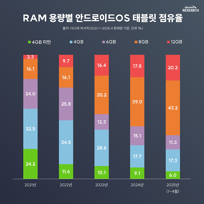 다나와리서치에 따르면, 2021년에는 4GB 이하 제품이 전체의 절반에 가까웠지만 2025년에는 6% 수준으로 급감했다. 반면 8GB RAM 탑재 제품은 2021년 16.1%에서 시작해 2025년에는 43.2%까지 상승하며 가장 높은 점유율을 기록했다. 12GB RAM도 같은 기간 3.3%에서 20.2%까지 성장하며 고성능 수요를 반영하고 있다.