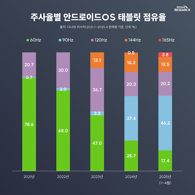 태블릿의 주사율도 급변하고 있다. 2021년만 해도 60Hz 제품이 78.6%를 차지했으나, 2025년엔 17.4%로 대폭 하락했다. 대신 90Hz 주사율의 비중이 빠르게 상승해 2025년에는 46.2%로 최대 점유율을 기록했다.