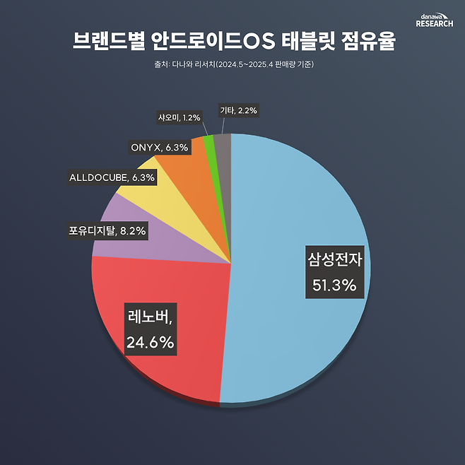 안드로이드 태블릿 시장은 삼성전자가 압도적 1위다. 다나와리서치에 따르면, 지난 1년 동안 삼성전자는 전체 점유율의 51.3%를 차지하며 시장을 과반 이상 장악하고 있다.