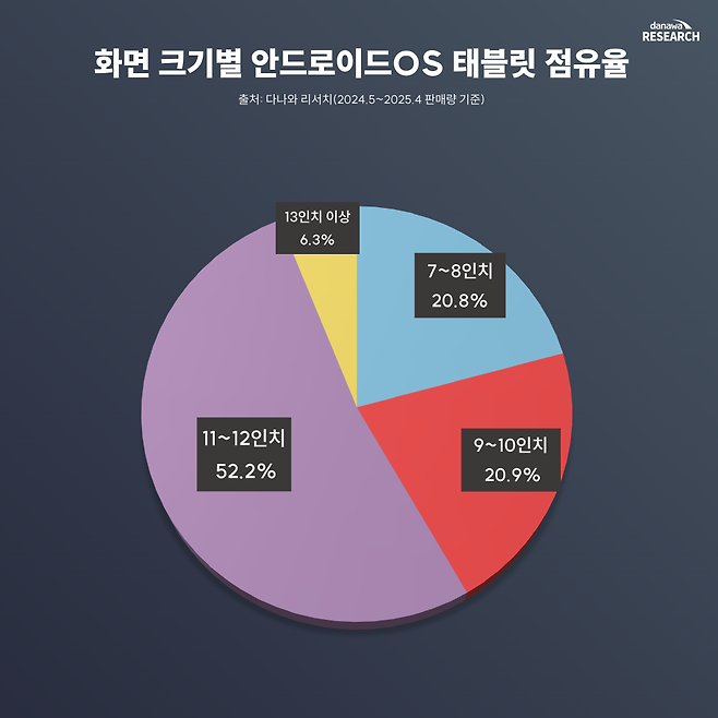최근 안드로이드 태블릿 시장에서는 11~12인치대 제품이 가장 강세를 보이고 있다. 전체의 52.2%를 차지하며 절반 이상 점유율을 기록, 가장 선호되는 크기로 자리 잡았다. 교육, 업무, 영상 시청 등 다용도로 활용하기에 적합해 실사용 만족도가 높은 것이 주된 이유다.