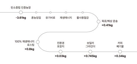“남미의 탄소중립인증을 받은 농장에서 원두를 납품 받습니다. 농장에서 화학비료 대신 유기농 비료를 사용하고, 재생에너지로 전력을 충당합니다. 항공운송 대신 선박운송으로 원두를 들이고, 100% 재생에너지로 가동되는 RE100 공장에서 로스팅을 하죠. 물 사용을 최소화한 가공방식을 채택했고요. 그렇게 만든 원두나 완제품을 친환경 소재로 포장합니다. 원두 공정 과정에서 발생한 폐기물은 업사이클링하죠. 국제학술지 GEO 기준으로 커피 원두 1kg당 15.3kg의 탄소를 배출하는데요. 저희 커피는 원두 1kg당 1.28kg의 탄소를 되레 저감합니다. 기존의 커피를 저희 커피로 대체하면 총 16.6kg의 탄소 배출을 막을 수 있는 셈이죠.”
