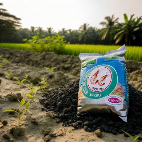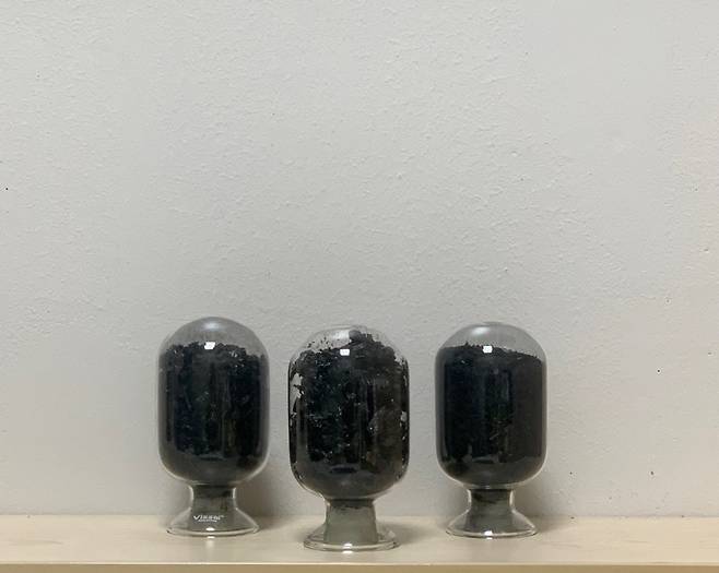 “새우 부산물을 스폰지 같은 고체 형태로 가공한 자재입니다. 농업용 비료는 보통 액상으로 제조하는데요. 액상으로 가공하면 돈이 많이 들어요. 방글라데시는 물이 귀하고 화학처리 설비가 비싼 나라라 현지 상황에 맞지 않습니다. 저희는 생화학적 추출 과정을 배제하고 물리적인 방식인 열분해 공법으로 새우 부산물을 가공합니다. 이렇게 가공하면 폐수나 폐자원이 발생하지 않아 환경에 미치는 영향이 적어요. 게다가 수율이 50%로 높은 편입니다. 현재 하루 2톤의 부산물을 처리해 1톤의 소재를 만들 수 있어요.”