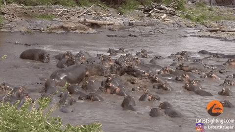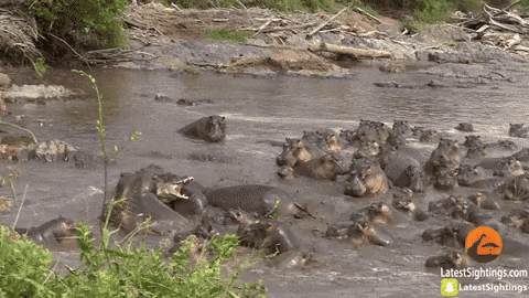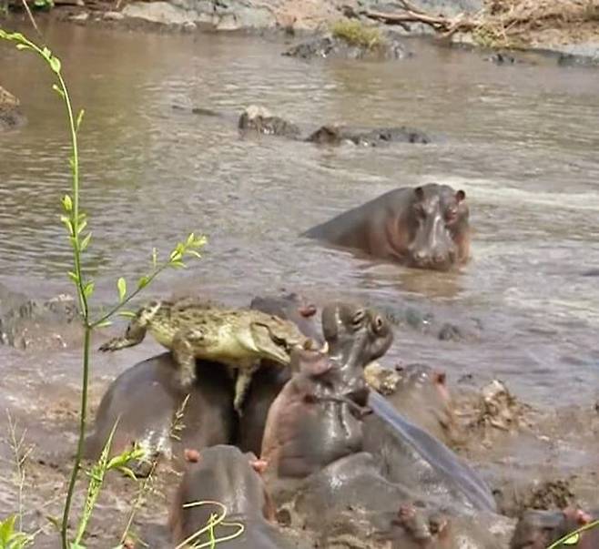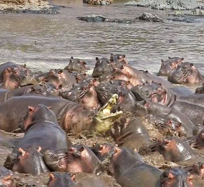 악어는 얼마 가지 못해서 하마들에게 들통이 난 것인데요. 한순간에 하마 30마리떼에 갇히게 된 악어. 과연 악어의 운명은 어떻게 됐을까요.