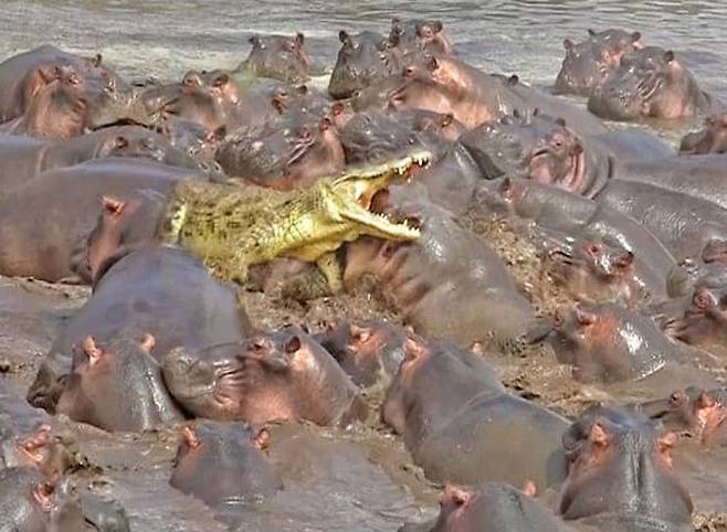 하마들은 악어를 무리 안으로 끌어 들인 다음 서로 막 공격하기 시작했는데요. 순식간에 하마들 무리에 둘러싸인 악어는 혼자서 어떻게 해서든 살아남기 위해 발악을 하기 시작했죠.