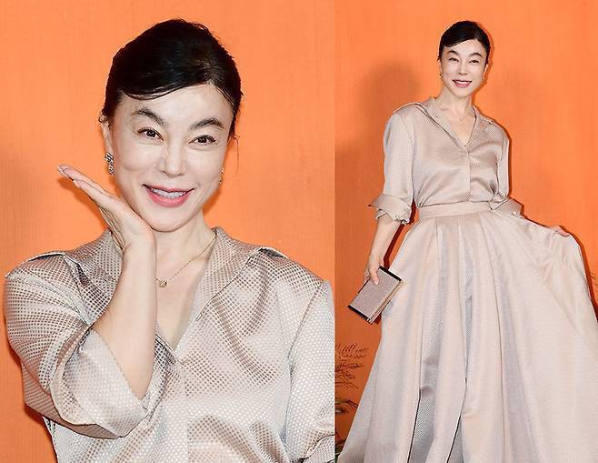 배우 최화정이 베이지 드레스와 클러치백으로 럭셔리 스킨케어 브랜드 행사에서 고급스러운 스타일을 완성했습니다.