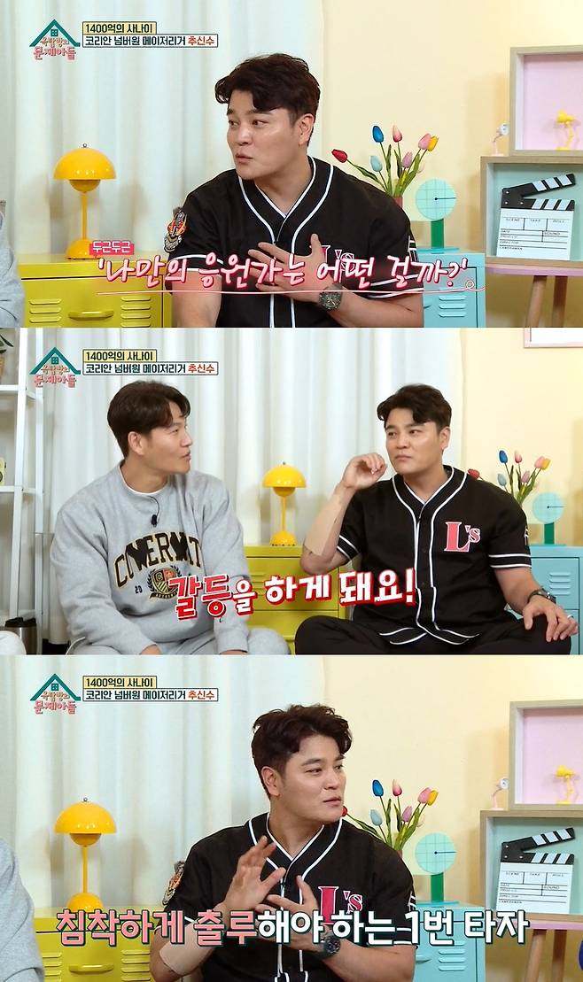이날 김종국은 "한국의 응원송 문화를 신기해했다고 들었다"고 물었고, 추신수는 "미국에는 전혀 없는 문화다. 그래서 한국에 온다고 결심했을 때 '나만의 응원가는 뭐가 나올까' 기대를 했었다"면서 "응원단장님이 노래를 만들어서 들려주셨는데, 그 때 당시에는 괜찮았는데 자꾸 갈등을 하게 된다"고 고백했다.