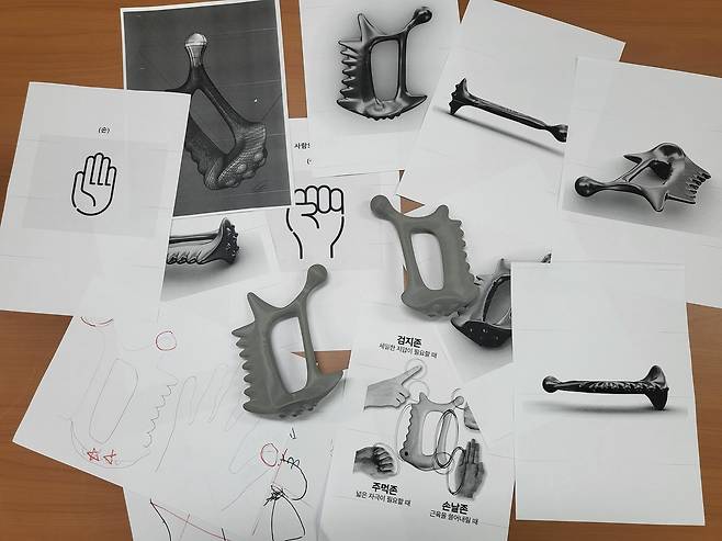소비자가 기능을 한눈에 알아볼 수 있도록, 제품 부위별 명칭을 정했다. 광고 마케팅을 하던 실력이 활용됐다. “손의 부위별 명칭을 응용했어요. 미리 기능을 정리해두면 본래 취지에서 벗어나지 않게 제조할 수 있고, 나중에 상세페이지를 만들 때도 소비자에게 제품을 쉽게 알릴 수 있어요. 부위별로 어디에 사용하면 좋은지 특징을 정리했습니다. 주먹존은 어깨·복부 등 넓은 근육에, 꿈치존은 강한 지압이 필요할 때. 이런 식으로 말이죠.”